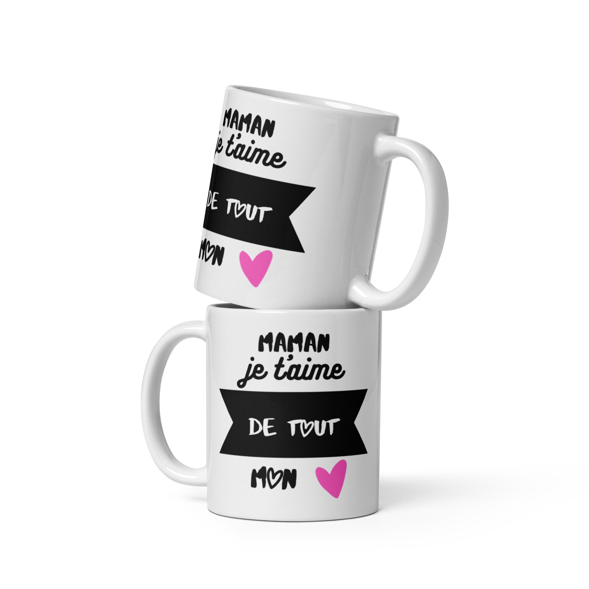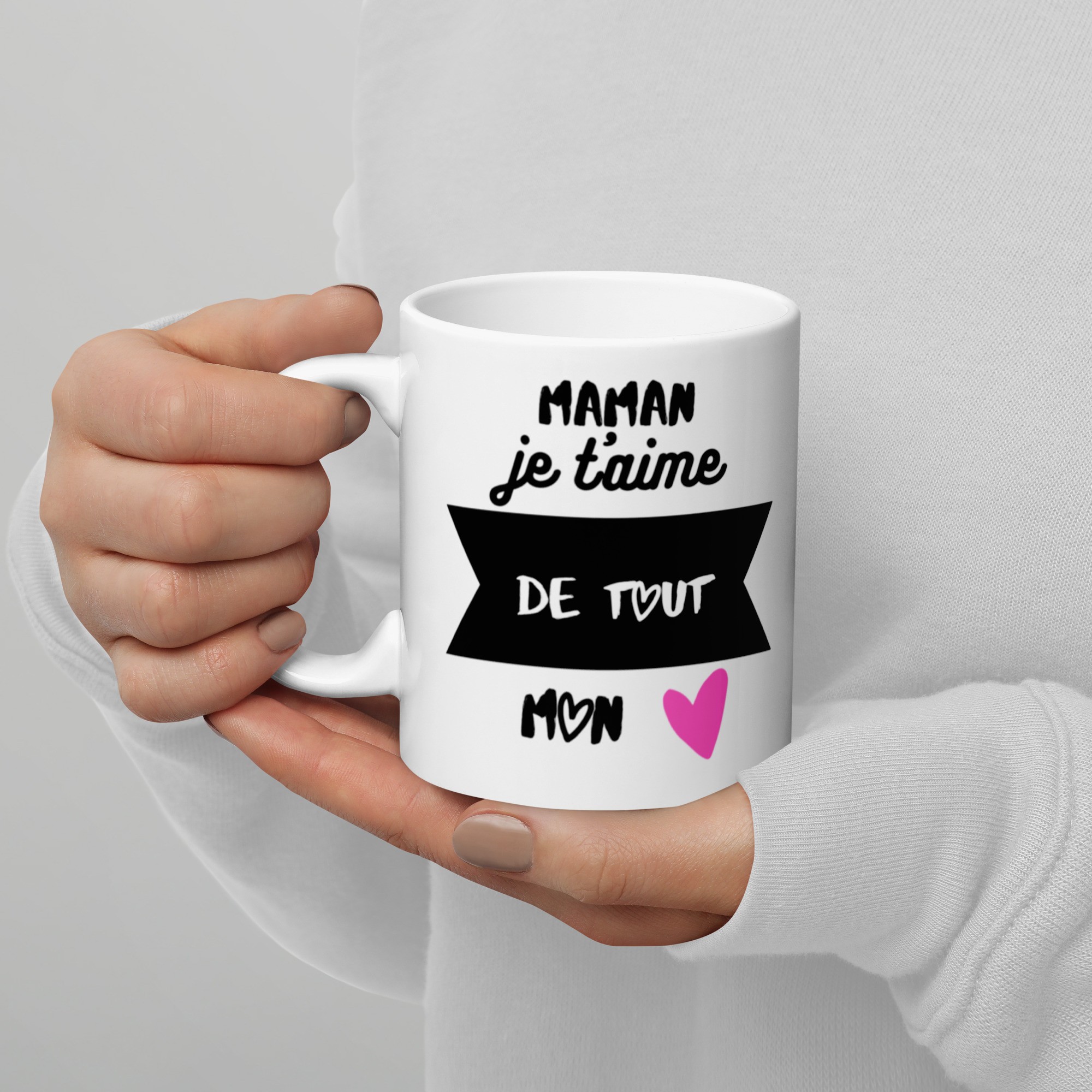 Ce mug en céramique de haute qualité arbore un design tendre et moderne : Maman je t'aime de tout mon cœur.