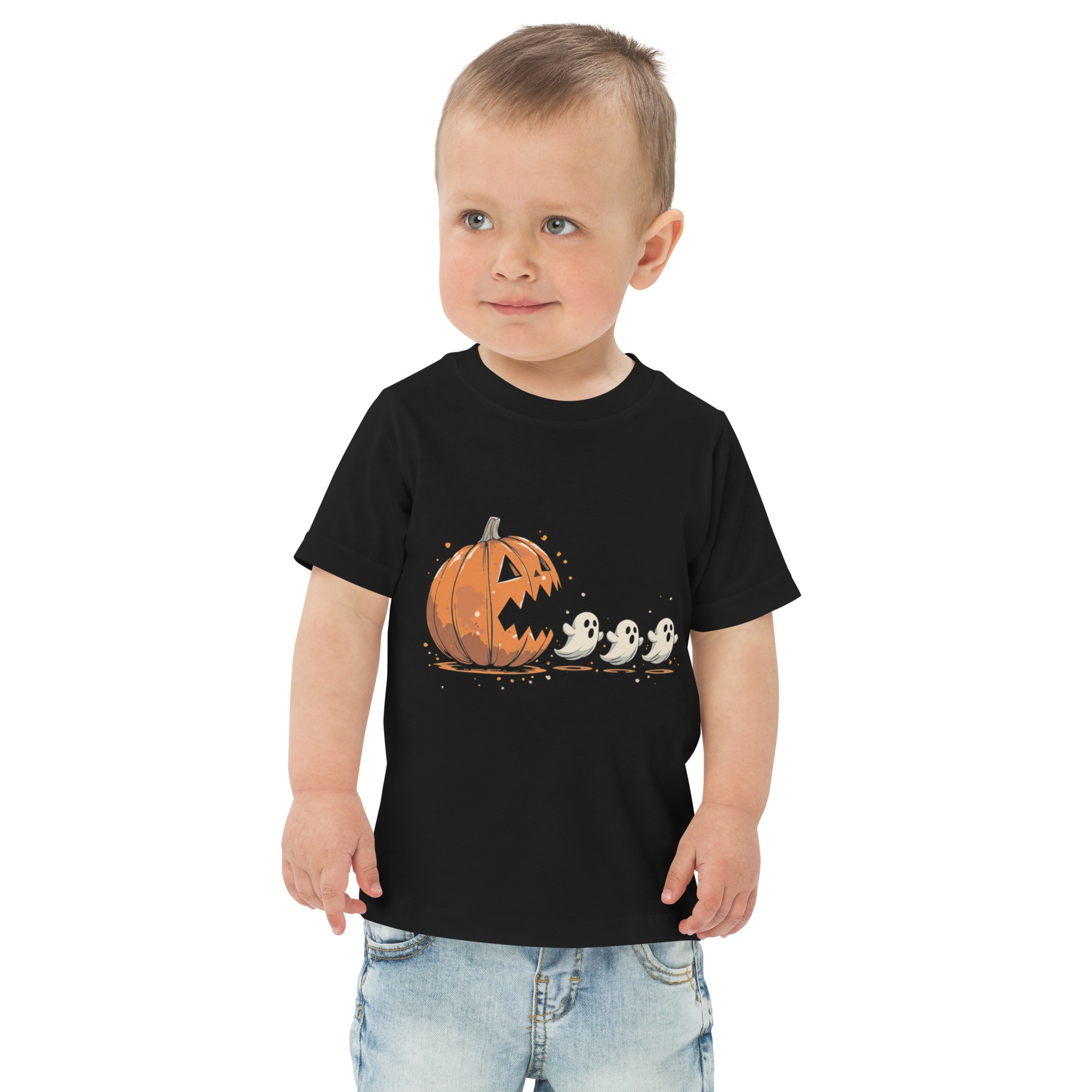 Votre petit trésor sera adorable avec cette illustration rigolote d'une citrouille amicale et de ses trois petits fantômes farceurs.