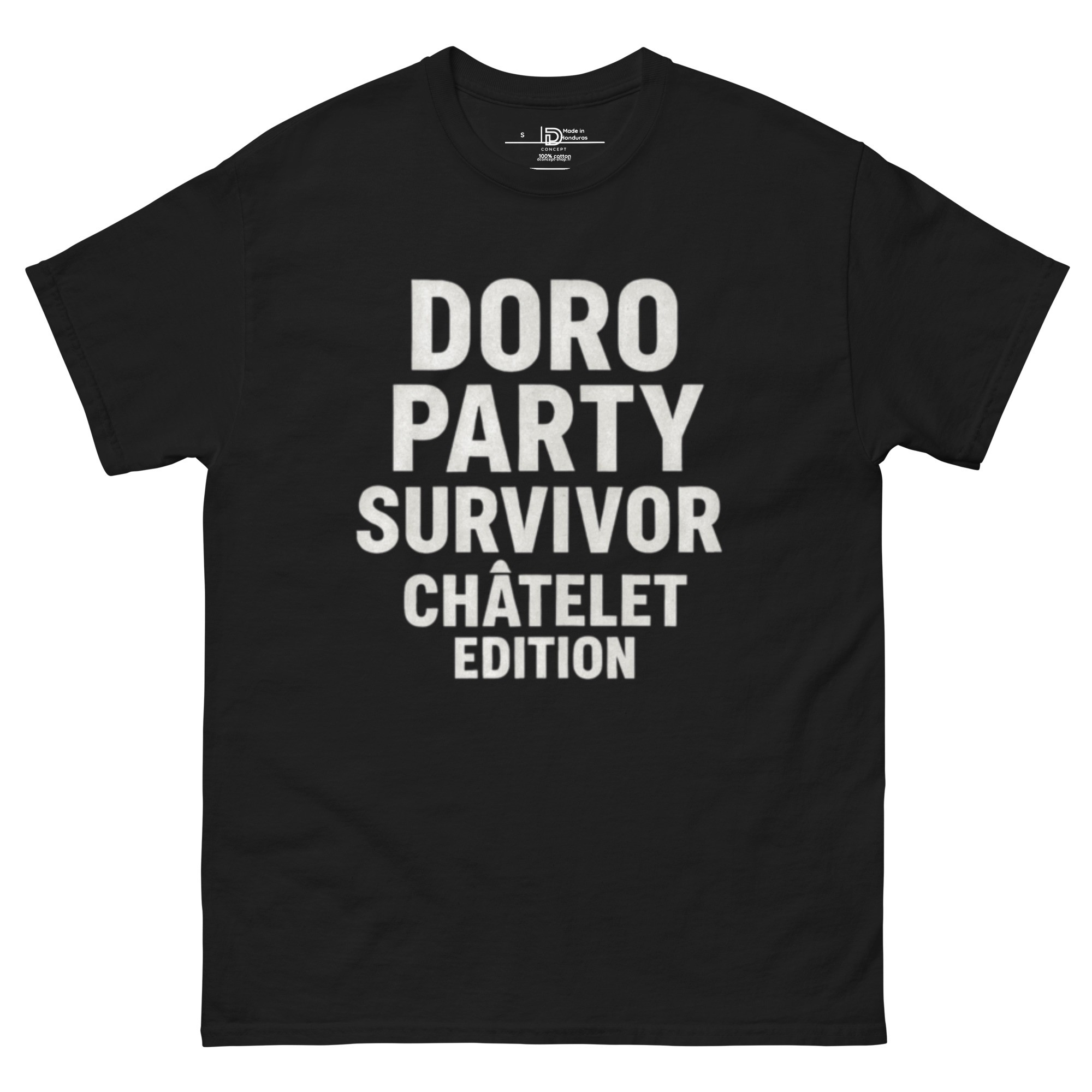 Affirme ton style avec le t-shirt “Doro Party Survivor – Châtelet Edition”, clin d’œil parfait au mème viral qui enflamme TikTok et les réseaux. Contactez-nous pour un tarif dégraissif par lot de 25 !