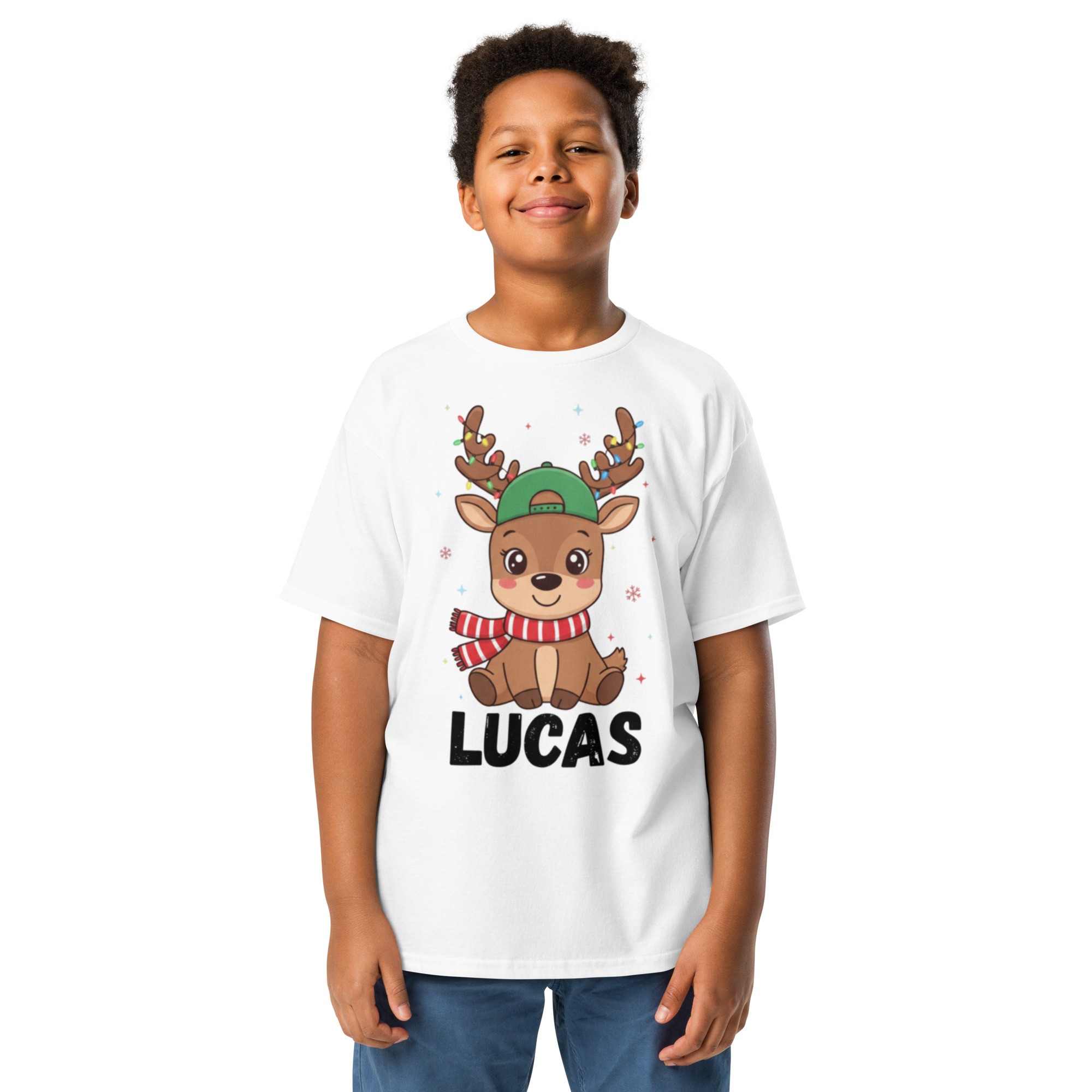 Personnalisation Incluse : Le prénom de votre choix est imprimé en lettres noires audacieuses sous le renne, rendant ce t-shirt vraiment unique.