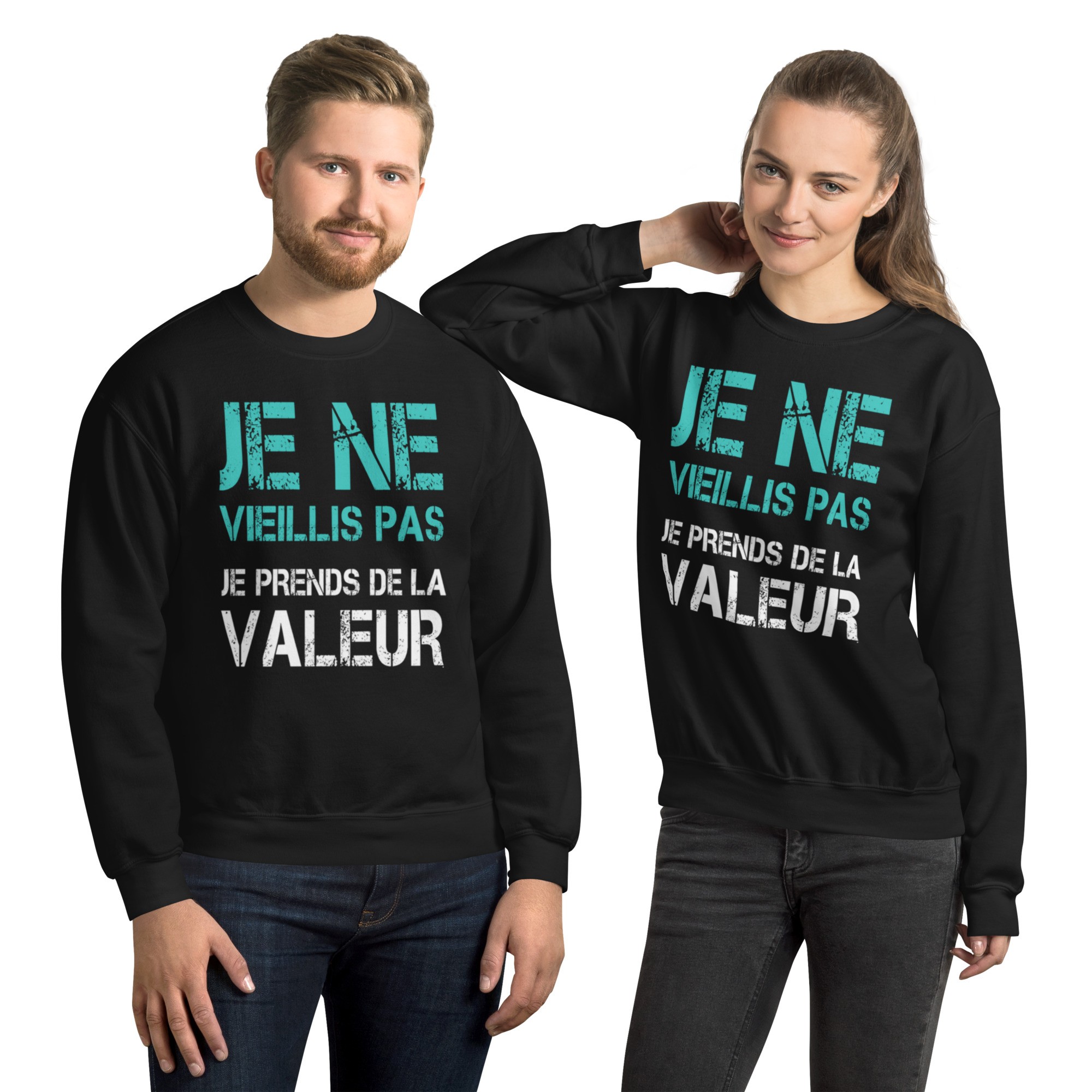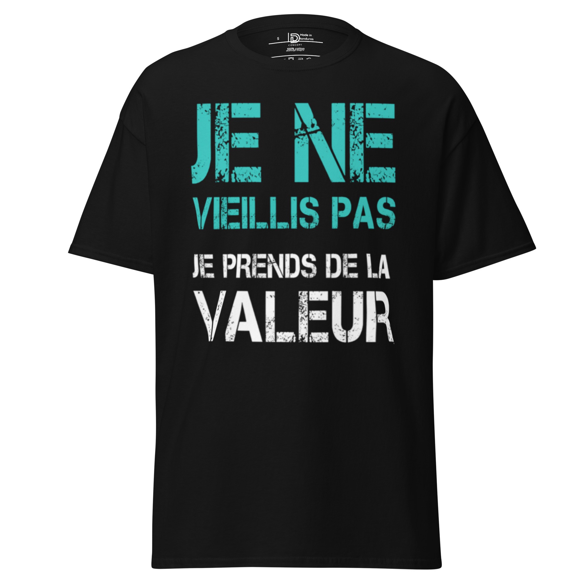 Mettez en avant votre style et votre confiance avec ce visuel original "JE NE VIEILLIS PAS, JE PRENDS DE LA VALEUR" imprimé en haute définition grâce à la technologie DTG (Direct to Garment).