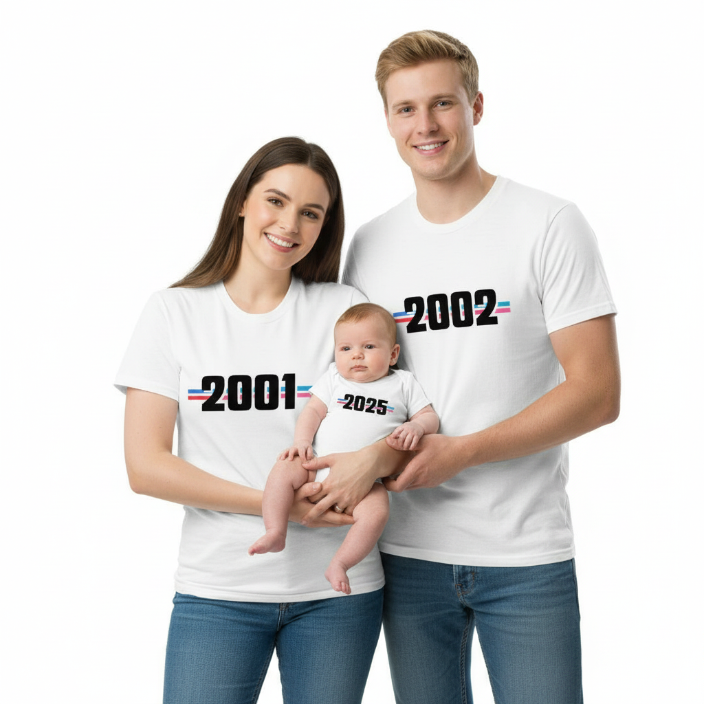 Craquez pour ce lot* de vêtements assortis pour papa, maman et bébé, avec leurs dates de naissance imprimées dans un style moderne comportant des bandes bleu/blanc/rouge ultra tendance.