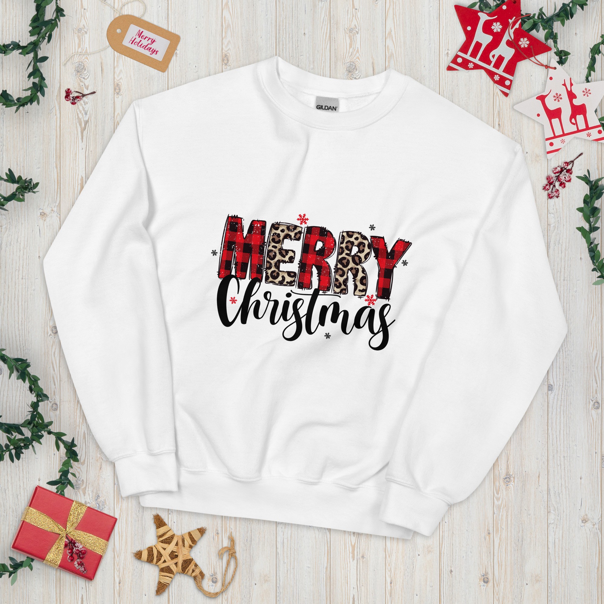 Affiche ton esprit festif avec style grâce à ce sweat Noël "Merry Christmas"au design moderne mêlant motifs tartan rouge et touches léopard. U