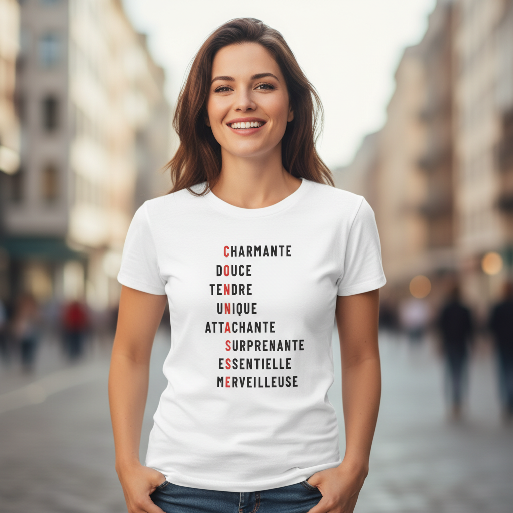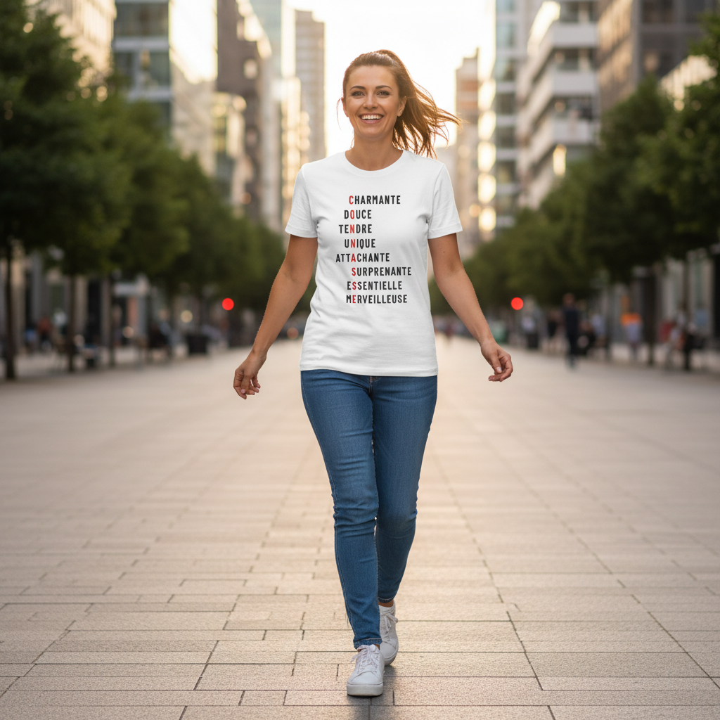 Ce t-shirt unique joue sur les mots avec élégance. De loin, un mot piquant s'affiche en rouge, mais de près, c'est une véritable déclaration de vos meilleures qualités !