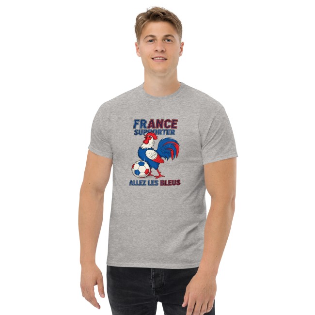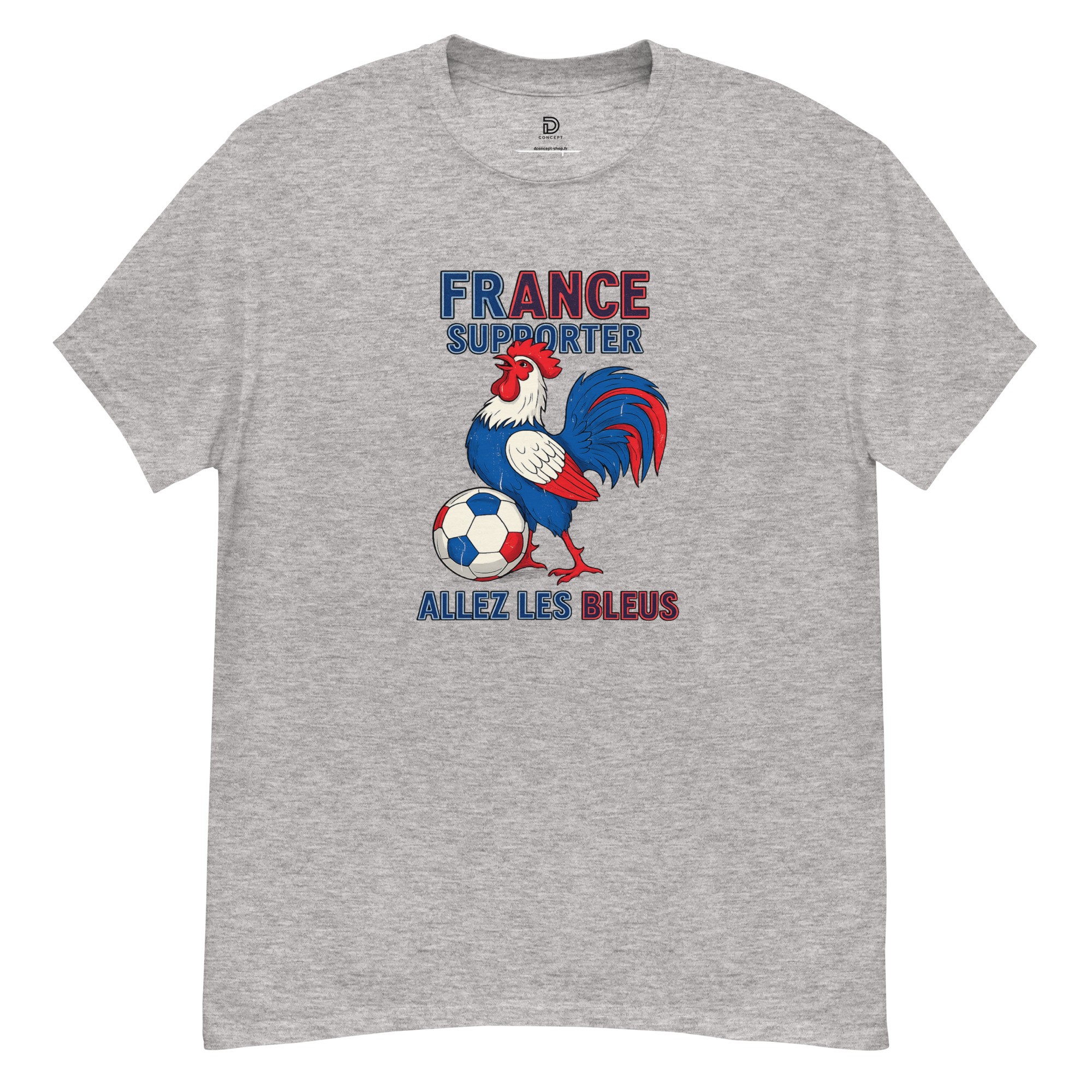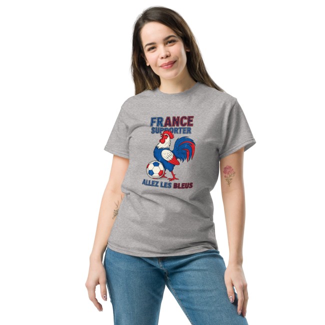 Design Exclusif : Un coq emblématique au style vintage accompagné de la typographie "Allez les Bleus" pour un look nostalgique et indémodable.