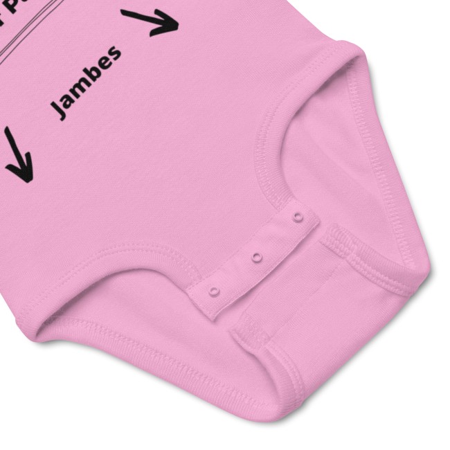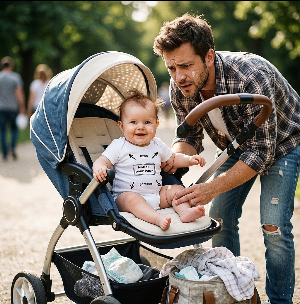 Conçu comme une véritable notice d'utilisation avec des flèches indicatrices, il est le clin d'œil parfait pour les papas un peu perdus (ou simplement pour s'assurer que les bras vont bien dans les manches !).