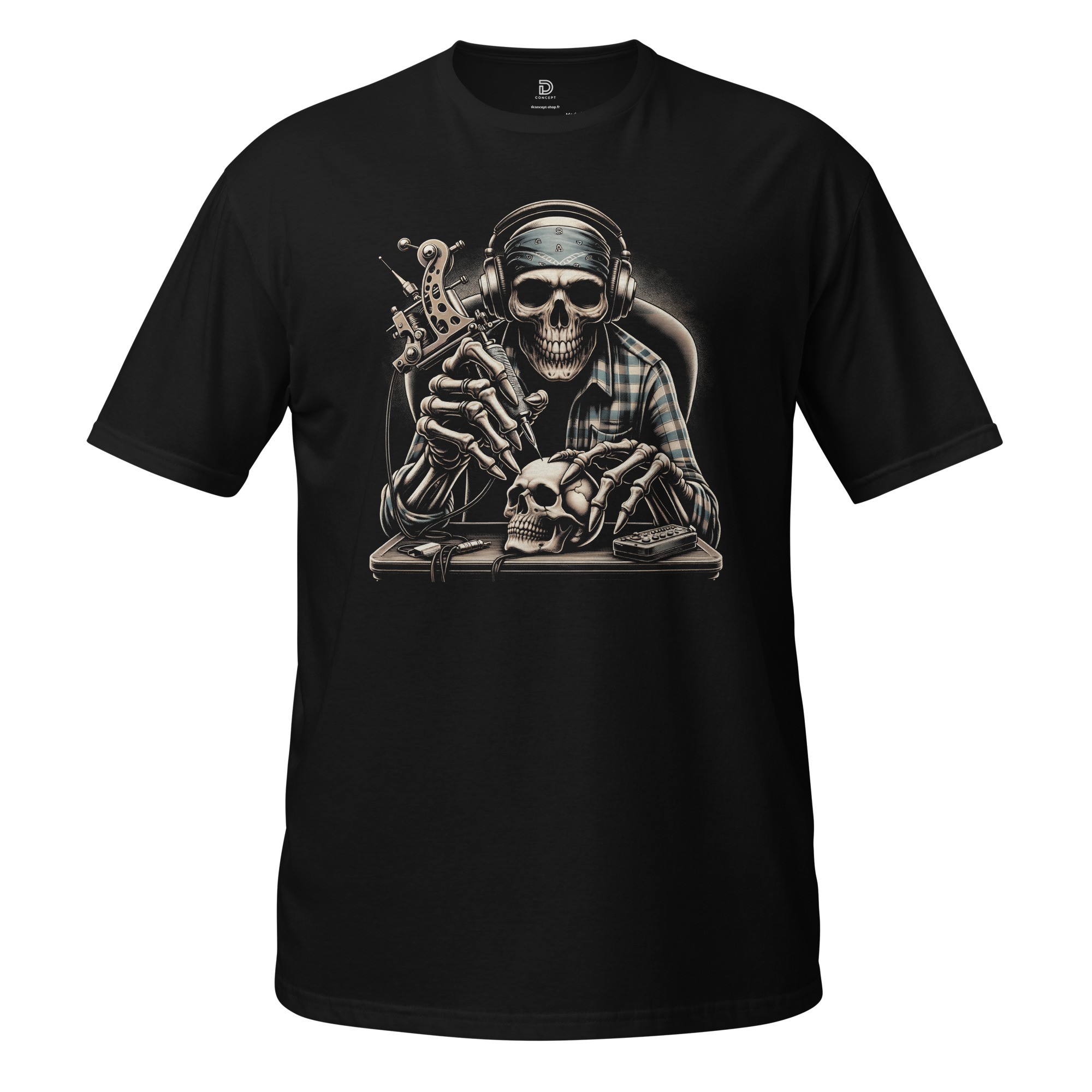 Affichez votre passion pour l'art du tatouage avec ce design exclusif. Alliant l'esthétique rebelle du squelette biker et l'univers du son, ce t-shirt met en scène un squelette tatoueur de précision, casque audio sur les oreilles, en plein travail sur un crâne.
