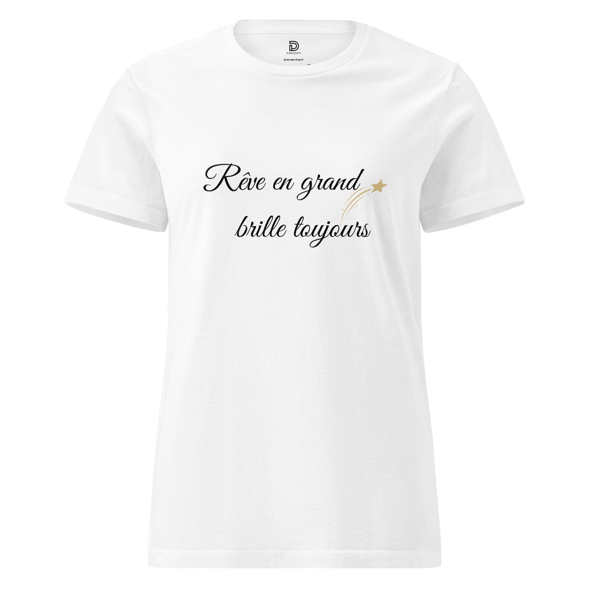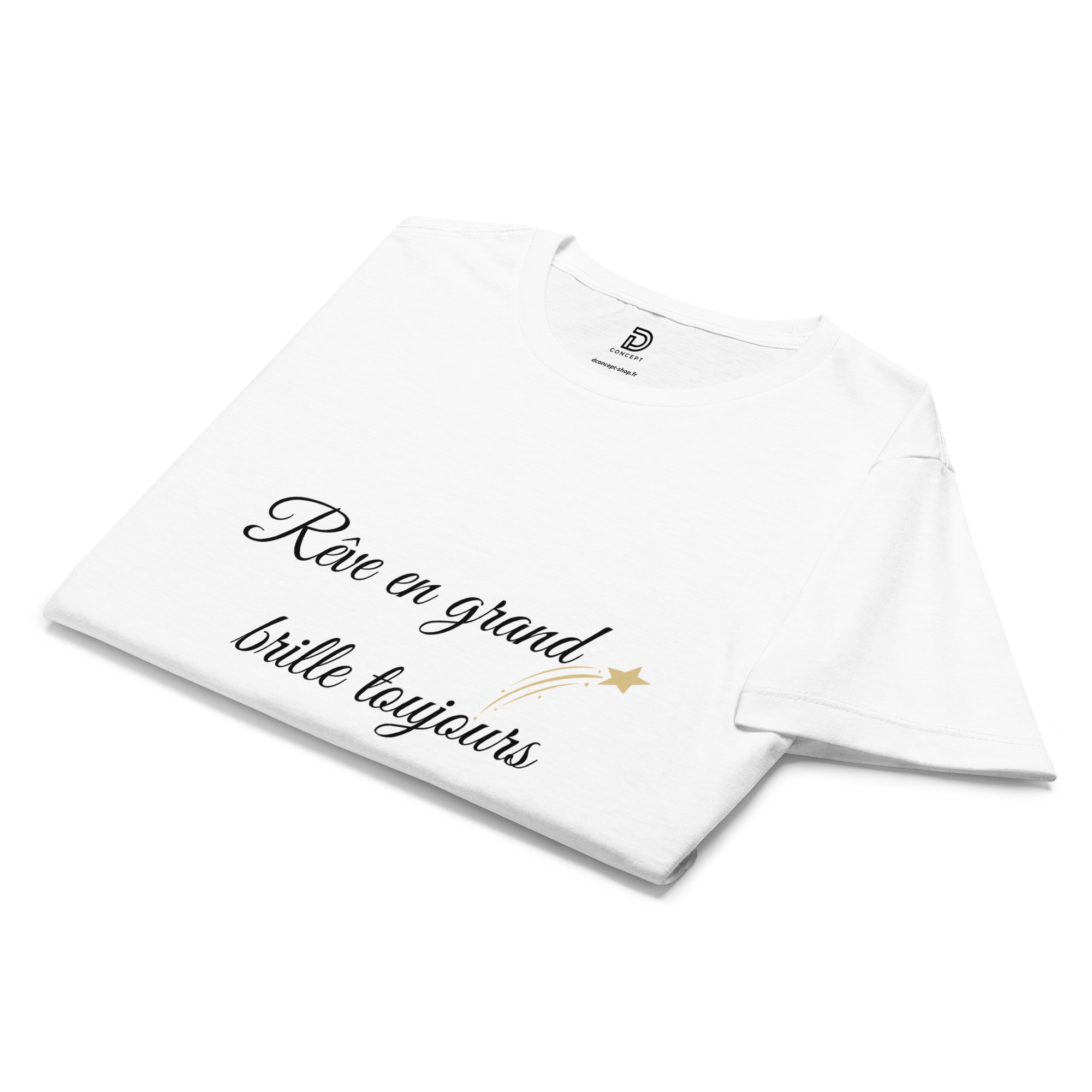 Ce t-shirt pour femme arbore un message inspirant et élégant : "Rêve en grand, brille toujours", accompagné d'une délicate étoile filante dorée. C'est la pièce idéale pour celles qui recherchent un look à la fois décontracté, positif et sophistiqué.