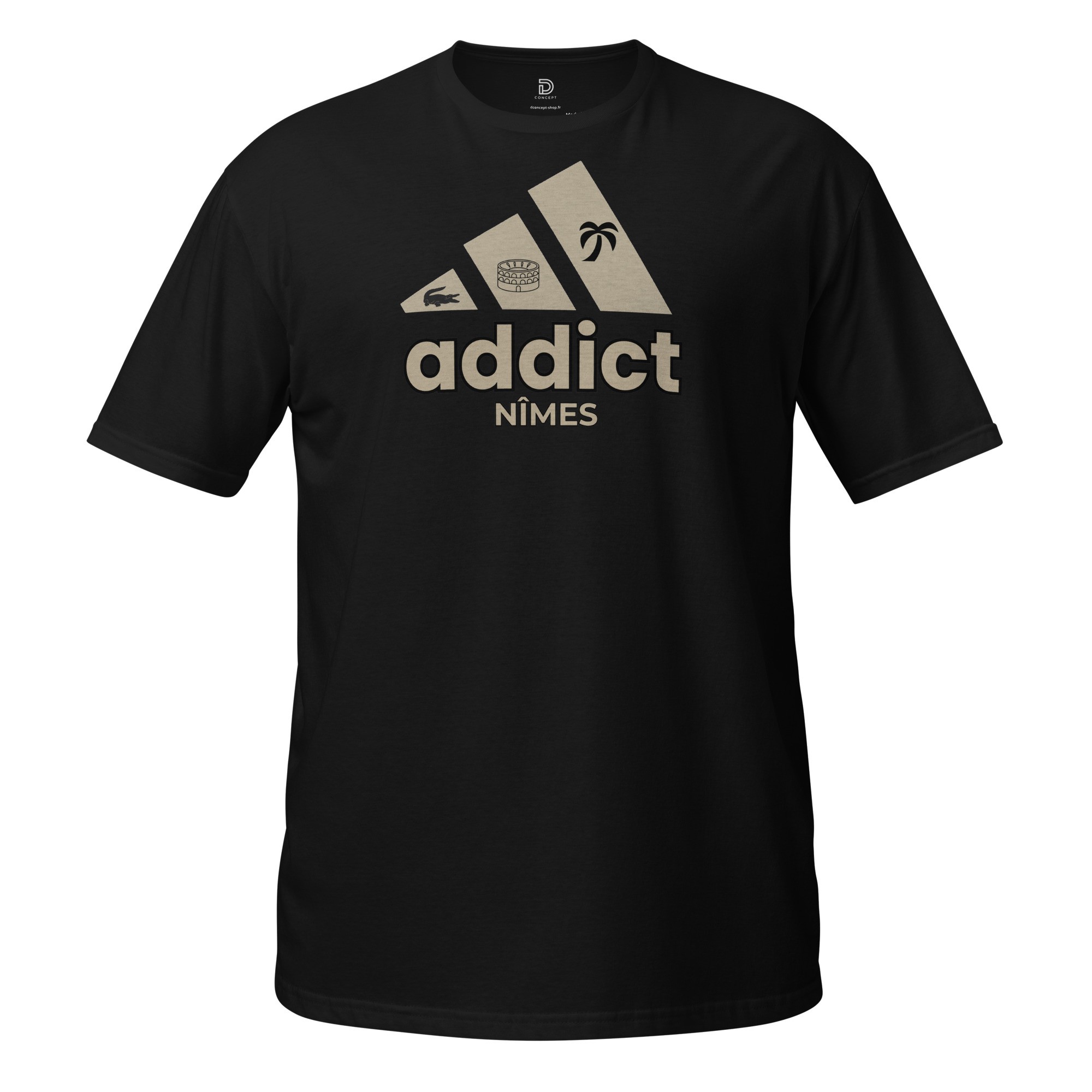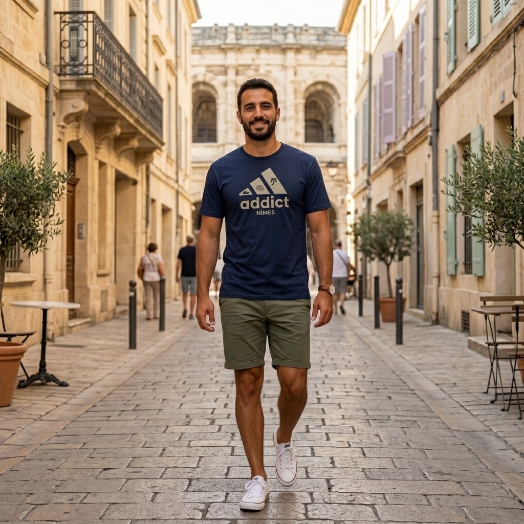 Le design "Addict Nîmes" intègre avec finesse les symboles emblématiques de la ville : le crocodile historique, les Arènes majestueuses et le palmier iconique.