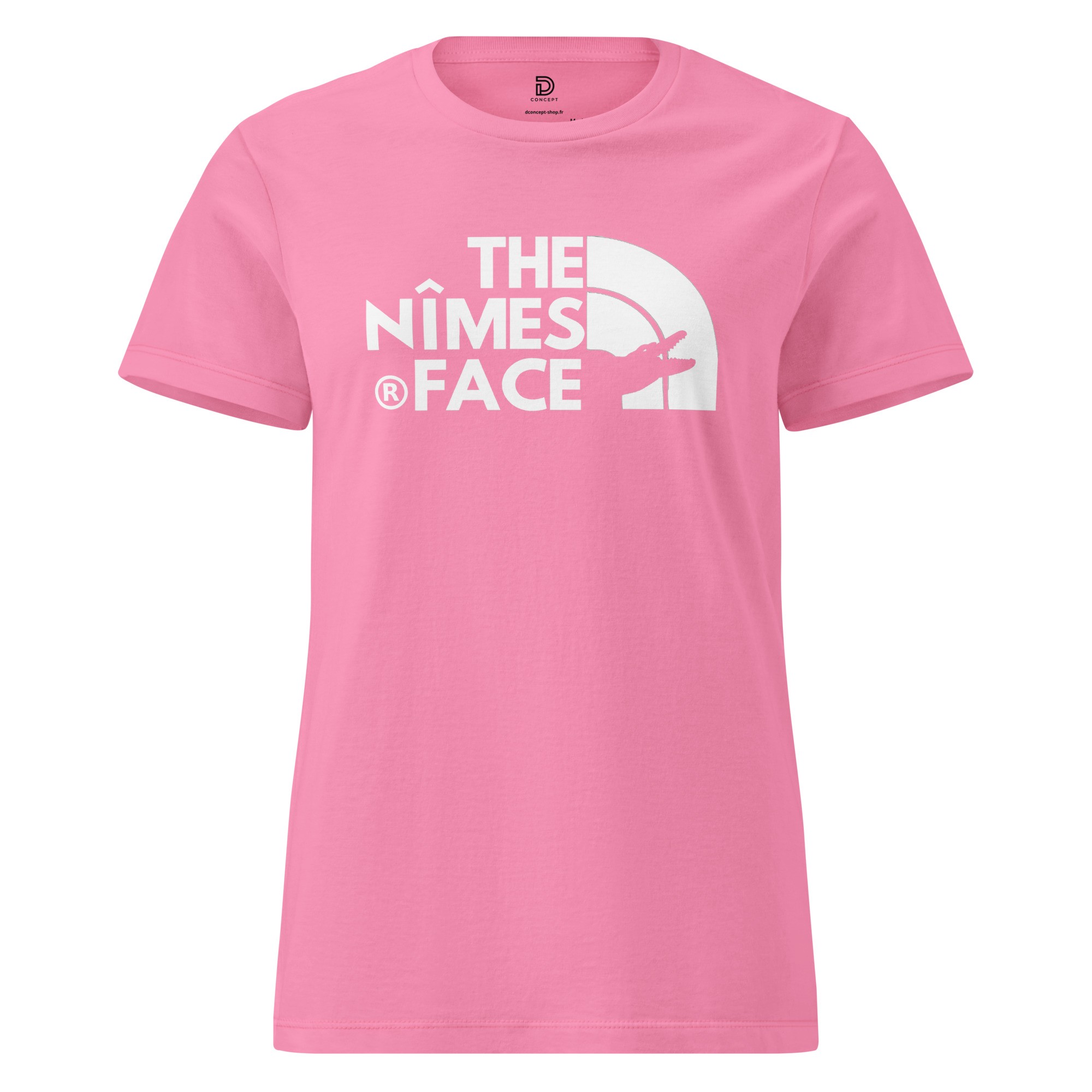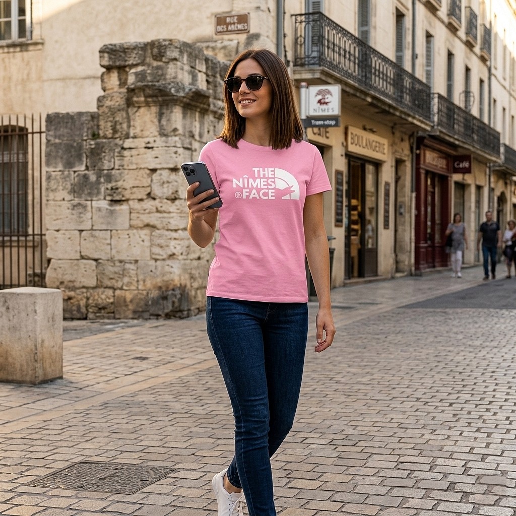Affichez votre fierté nîmoise avec style ! Ce t-shirt rose vibrant arbore le logo iconique "The Nîmes Face" revisité avec l'emblématique crocodile.