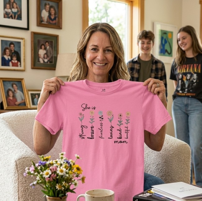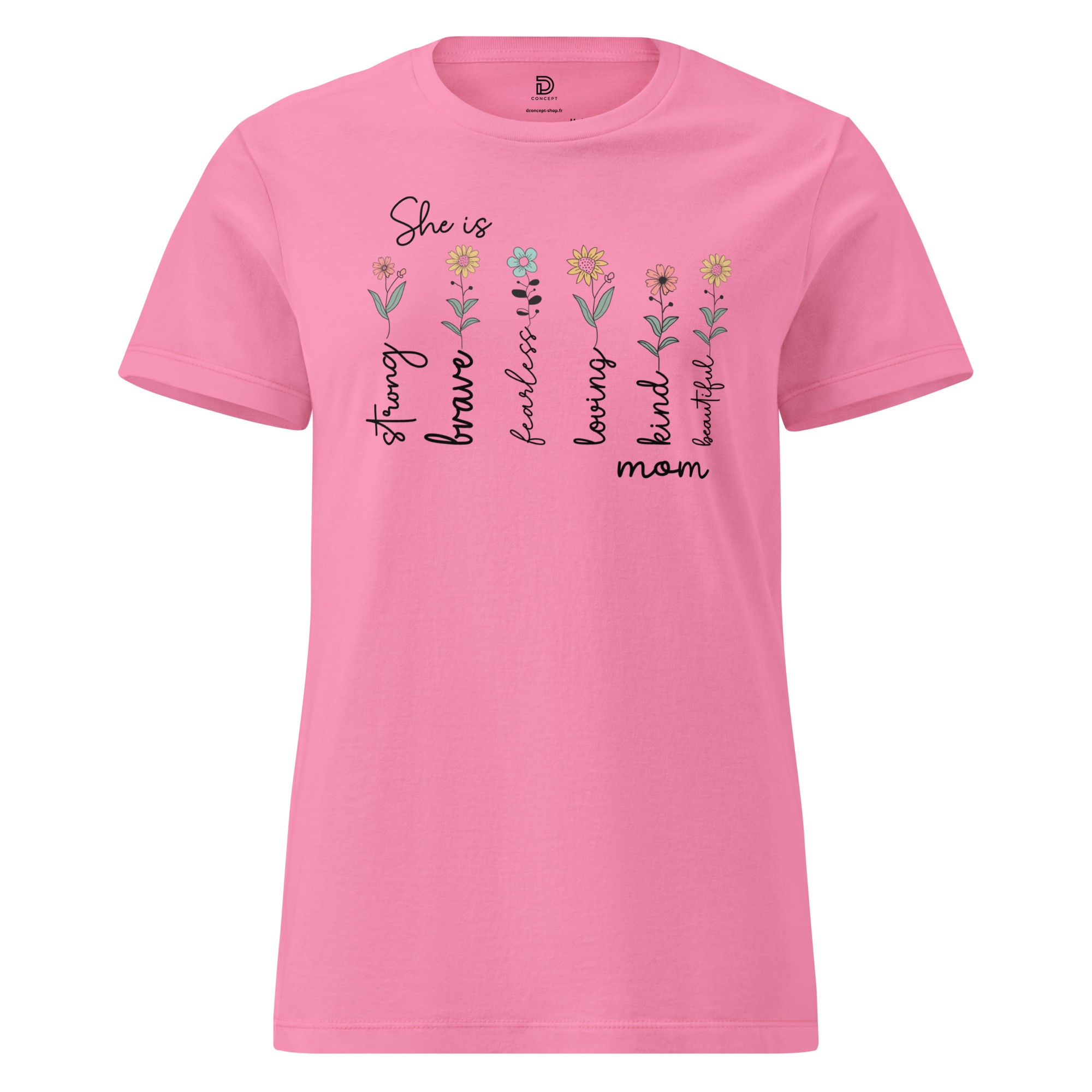 Célébrez la force et la douceur avec notre t-shirt exclusif "She is Strong, Brave, Fearless, Loving, Kind, Beautiful... Mom". Un design floral délicat qui rend hommage à toutes les facettes de la maternité.