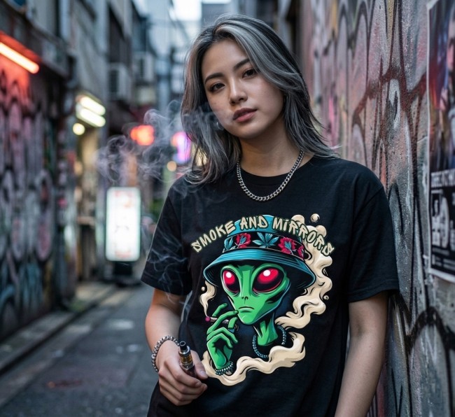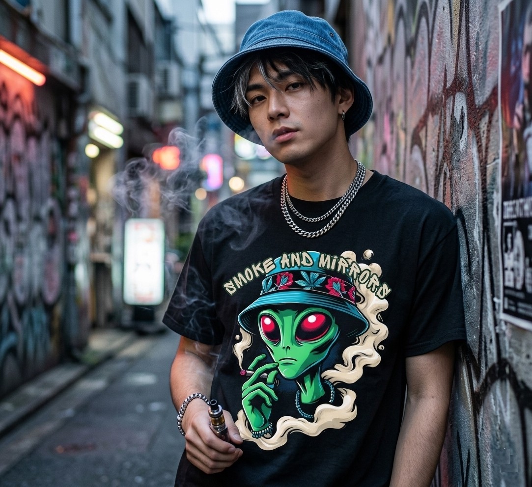 Ce t-shirt arbore un design d'alien ultra-détaillé au style urbain et psychédélique. Avec ses couleurs vibrantes et sa typographie "grunge" parfaitement intégrée, ce visuel ne se contente pas d'être vu : il impose son style.